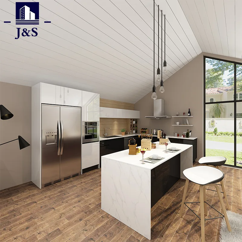 Tá cur chuige íostach i gceist lenár ndearaí comh-aireachta cistine saincheaptha, le línte glan agus caol a chomhlánaíonn aon chistin nua-aimseartha. Soláthraíonn an bailchríoch briosc bán elegance timeless nach dtéann riamh as stíl, agus ag an am céanna a chruthaíonn mothú oscailte agus aerúil do do spás. Tá an aeistéitiúil bán foirfe chun atmaisféar geal agus fáilteach a chruthú, rud a chuireann mothú iomlán scíthe i do theach chun cinn.
